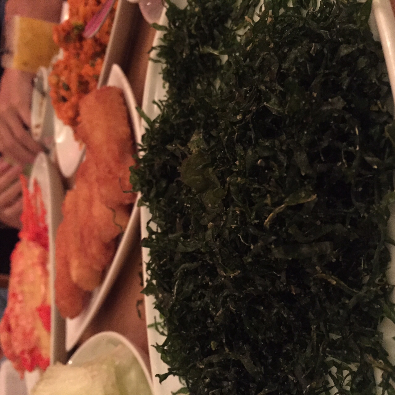 Foi servido de entrada Sqwab e Gambie – enroladinhos que são feitos na hora. O garçom ensina a fazer um e depois podemos fazer nós mesmos. O enroladinho é feito com folha de alface recheada com molho escuro (feito de pasta de soja, açúcar mascavo e ameixa), cubos de frango com abobrinha e especiarias (o sqwab) e couve frita desidratada crocante (gambie).