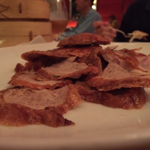 O cardápio exibe entradas e pratos a la carte, além de oferecer três tipos de menu degustação: o simples (R$ 149), com crispy duck (R$ 159 – mínimo de 2 pessoas) e com pato laqueado (R$ 169 – mínimo de 4 pessoas). Optamos pela opção com o pato laqueado já que o Otávio e a Denise queriam lembrar um pouco das suas viagens para a China. O pato laqueado leva 60 minutos para ser preparado, mas o tempo passa tranquilamente porque vão sendo servidos outros pratos antes. Ainda é possível escolher os pratos principais ou deixar que o chef escolha, optamos pela surpresa.