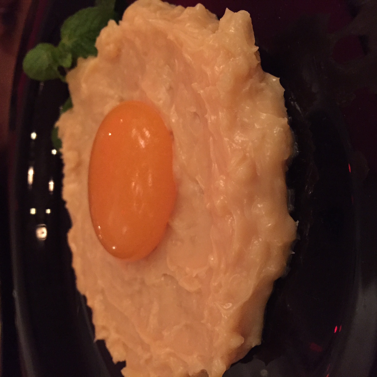 Eu já estava satisfeito, mas os demais ainda pediram de sobremesa o Uhn Ehggi – uma cocada mole que serve de base para uma esfera de maracujá, dando um aspecto de um ovo frito. Bem interessante e pelo que eles contaram estava delicoso.