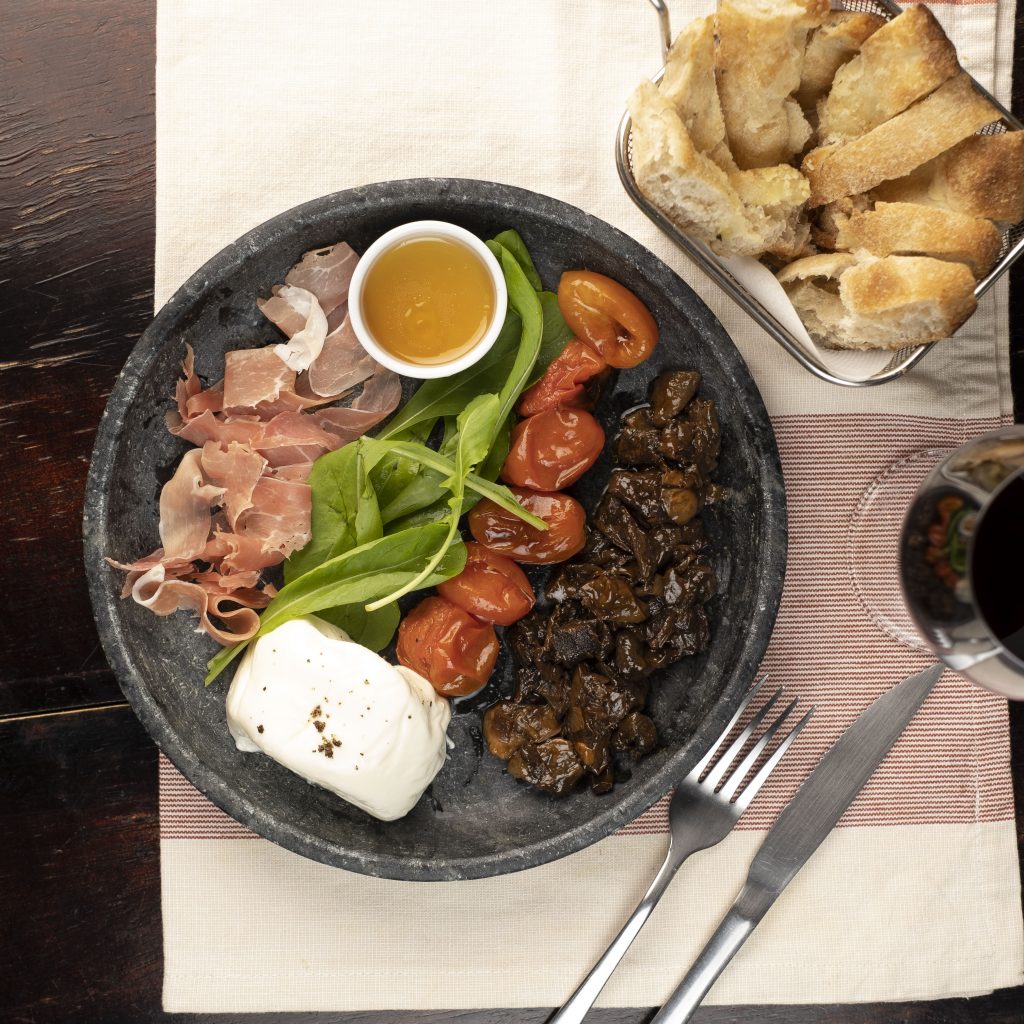 No cardápio do bistrô, localizado no Flamengo, uma das sugestões de entrada é a refrescante burrata especial (R$59,90) servida com tomates confitados, rúcula, presunto de parma e mix de cogumelos com focaccia e mel trufado.