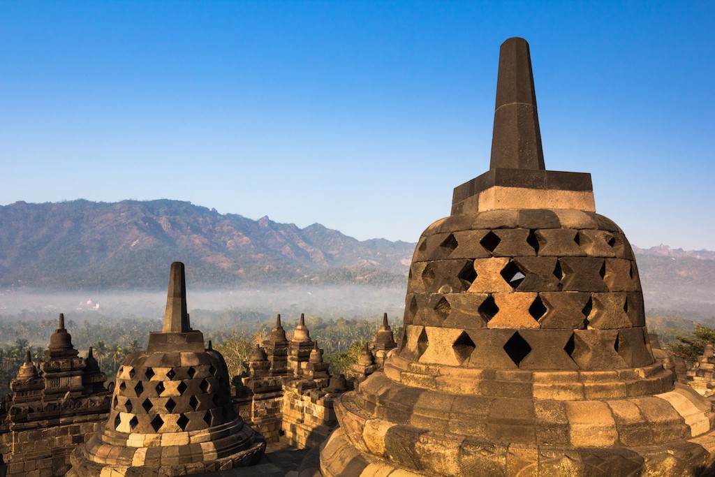 Borobudur, na Indonésia, é o maior monumento budista do mundo, sendo 300 anos mais velho que o mais conhecido Angkor Wat, no Camboja. Em uma região de plantações de arroz e selva, esta estrutura magnífica é uma mandala tridimensional (diagrama do universo), que foi redescoberta em 1814 e desde então se tornou um destino de peregrinação budista. Os entalhes que cobrem os blocos de rocha de lava e centenas de estátuas de Buda são infinitamente enigmáticos e particularmente bonitos quando vistos saindo da névoa da montanha pela manhã (foto de capa).