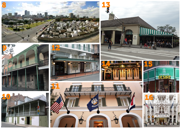Os apaixonados por “Entrevista com Vampiro” devem se dedicar também ao St. Louis Cemeteries (8) – 400 Basin St., no French Quarter, já que é lá que no livro está a tumba vazia de Louis. Na mesma região está a Gallier House (9) – 1132 Royal St. – que tem a fama de ser o modelo para a casa descrita no primeiro livro como a residência de Lestat, Louis e Claudia. Aliás essa rua serviu de locação para muitas cenas externas do filme, principalmente o trecho entre os números 700 e 900. Já a casa conhecida como Madame John’s Legacy (10) – 632 Dumaine St – foi locação para a cena em que os caixões estão sendo carregados enquanto a voz de Brad Pitt descreve Lestat e Claudia: “Uma criança prodígio com um desejo de morte”. Finalizando essa região para os adoradores do livro está o St. Louis Hotel (11) – 730 Bienville St. – que serviu de influência para o Novo Hotel Espanhol na história.