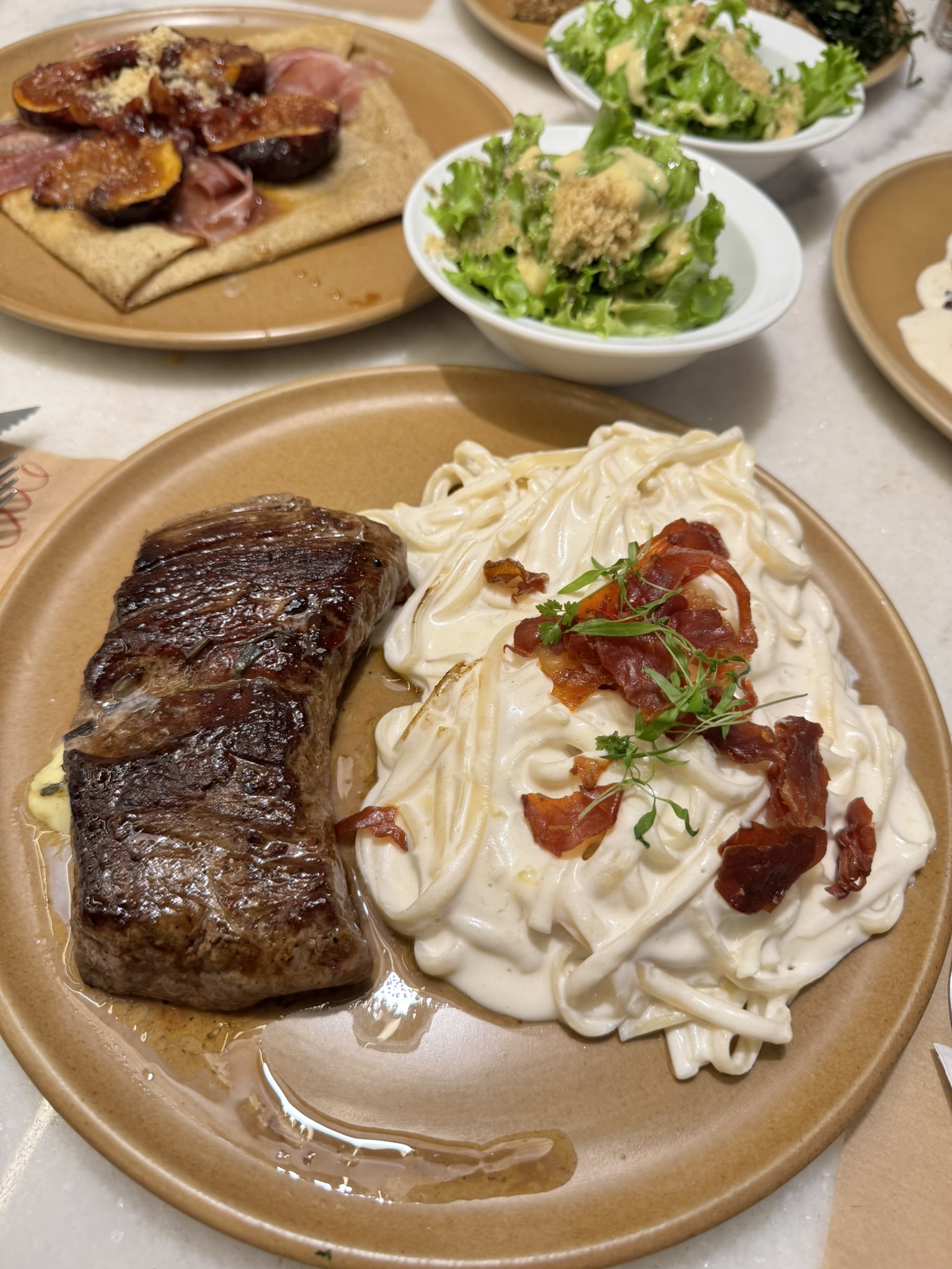 Apesar do sucesso das galettes, é possível experimentar excelentes pratos principais, como o Morgon – tornedor de mignon na manteiga de ervas com linguine ao molho de brie e crocante de parme Crédito: Maior Viagem/Amanda Santiago