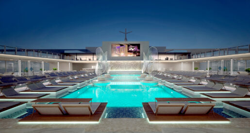 Com piscina aquecida, em espaço que à noite se converte em cinema, os navios da Emerald criam ambientação...