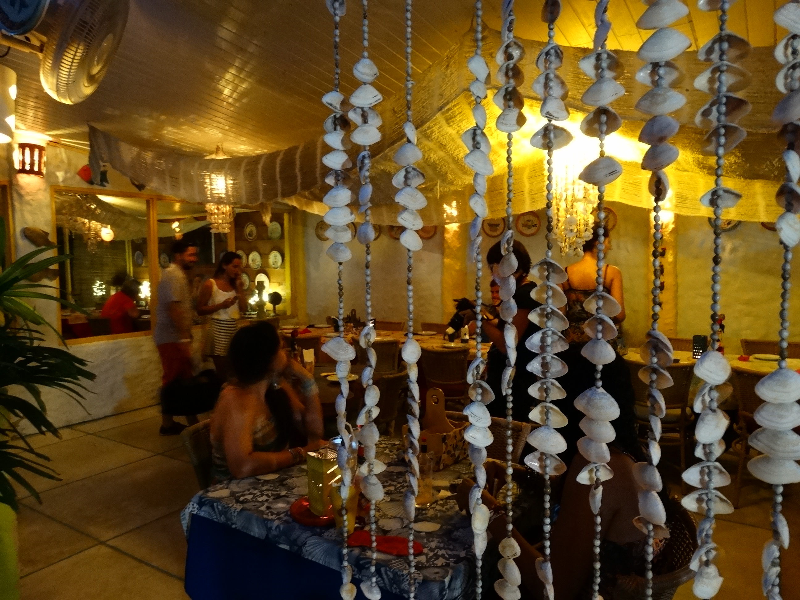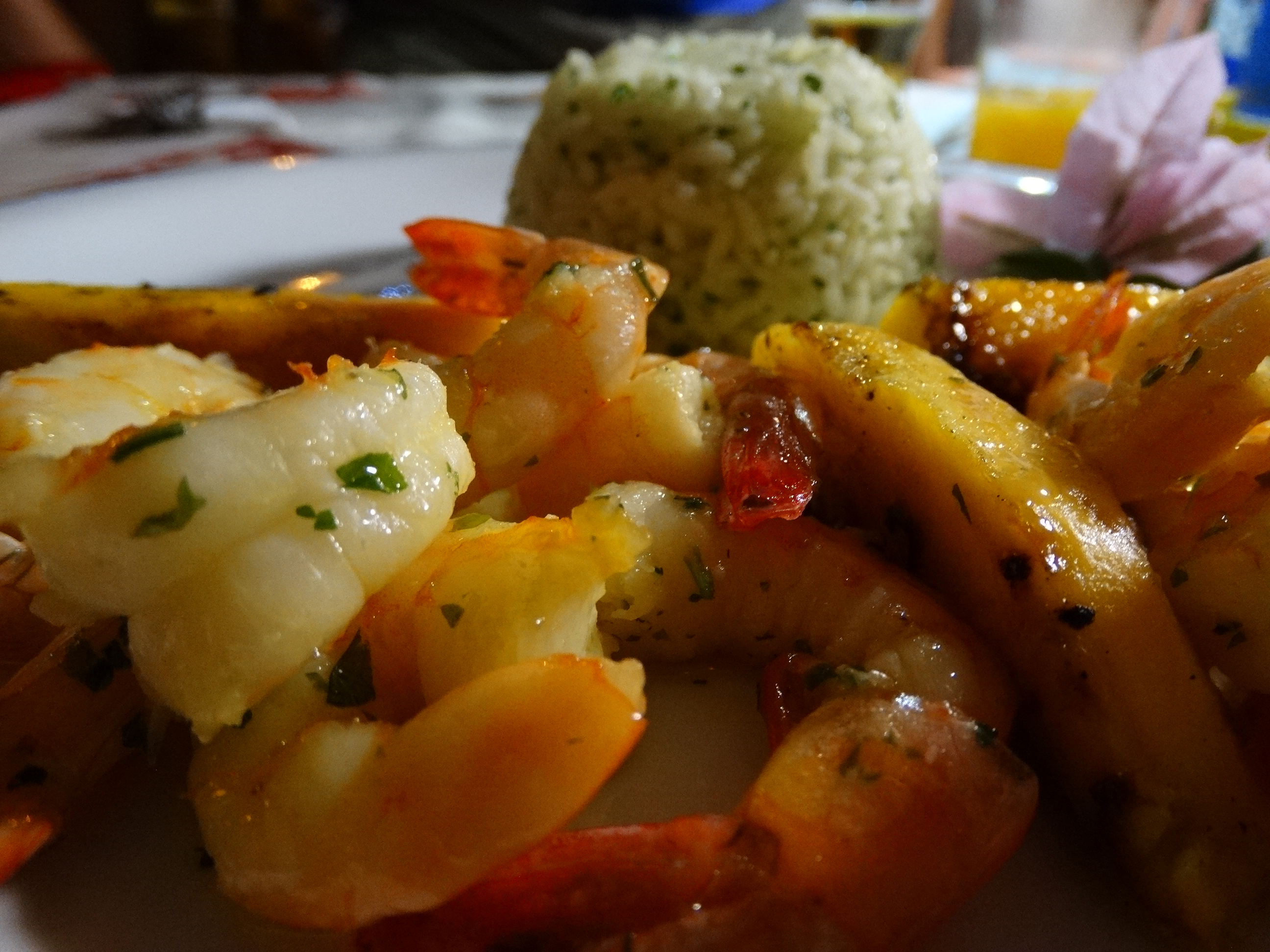 Beijupirá prato principalComo comentei anteriormente, os pratos principais de destaque são os pescados e frutos do mar que costumam ser feitos com alguma fruta tropical. Mas há também opções de carnes. Minha escolha foi o Camaranga – camarões flambados puxados na manteiga com fatias de manga grelhada com especiarias, acompanhado de arroz de aipo. O sabor do camarão junto ao doce da manga flambada torna o prato simplesmente incrível. Uma opção leve e saborosa para um jantar depois d eum dia inteiro de praia.