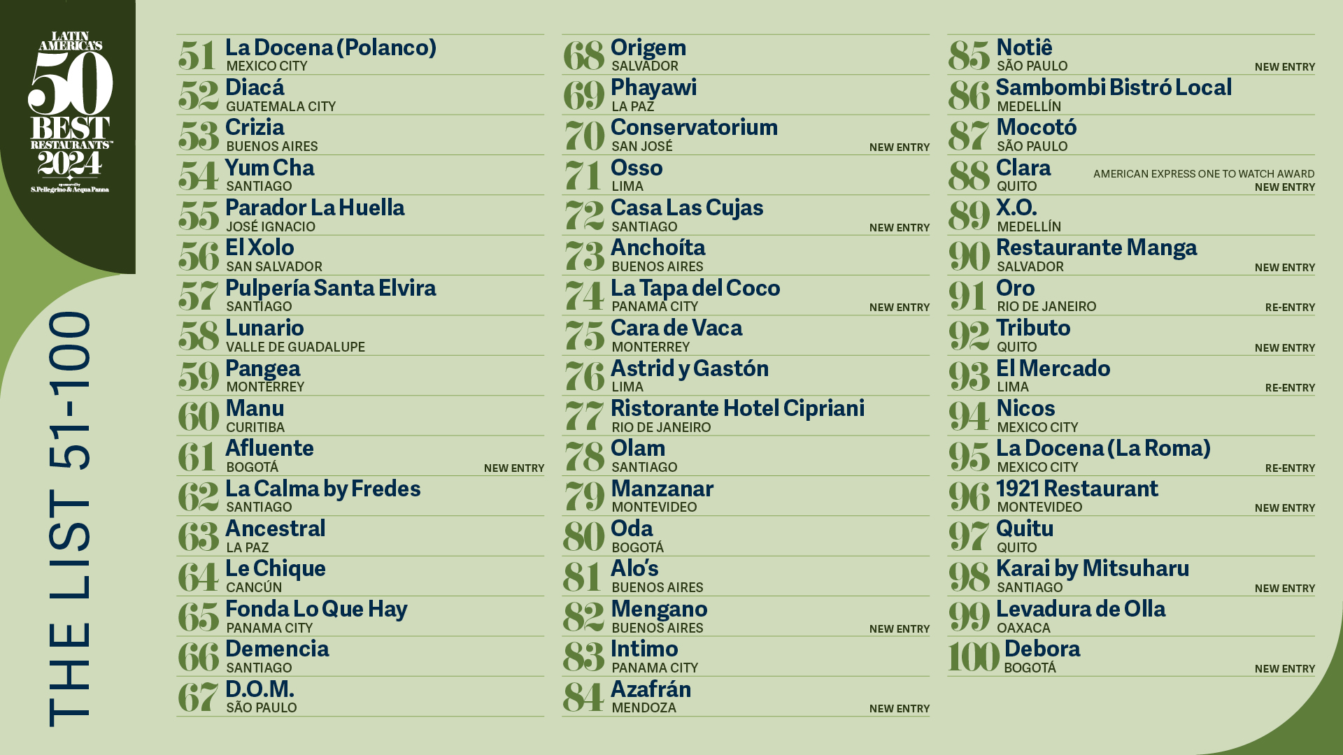 Confira a baixo todos os restaurantes listados nas posições 51 a 100 entre os melhores da América Latina e saiba mais informações sobre cada um deles no site oficial da premiação.