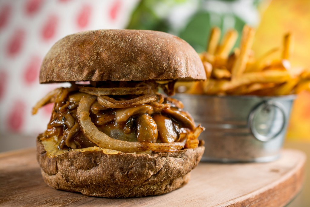 Miam Miam: Coguburger – 200g blend de carnes, sauté de cogumelos frescos, bacon, fonduta de queijo e rúcula no brioche servido com cebola frita (R$ 56).