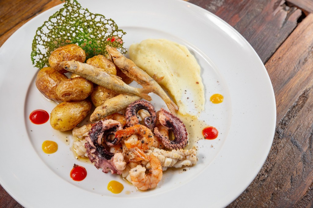 Polvo, lulas, camarões grelhados no azeite com manjubinhas crocantes, purê de limão siciliano e alecrim, batatas bravas e molho de pimentos morrones defumados. Um prato sofisticado, que reúne sabores e aromas clássicos da cozinha mediterrânea com ingredientes frescos.