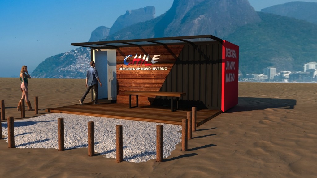 Um contêiner estilizado para parecer uma estação de neve chilena será instalado na orla de Ipanema. Em seu interior, também decorado de forma similar a um centro de esqui, a grande surpresa será um bar de gelo, onde turistas poderão experimentar drinques tradicionais chilenos enquanto vivem uma experiência super diferente. Pelo chão, neve por todos os lados completam o clima bem frio em uma das praias mais quentes da cidade. Ainda na parte interna do contêiner, haverá uma máquina de fazer “boomerangues” dos visitantes: eles se posicionam em frente a câmera, fazem gestos e movimentos engraçados, escolhem um tema de fundo com neve e recebem o resultado final direto no whatsapp, para compartilhar com os amigos e postar nas redes sociais.