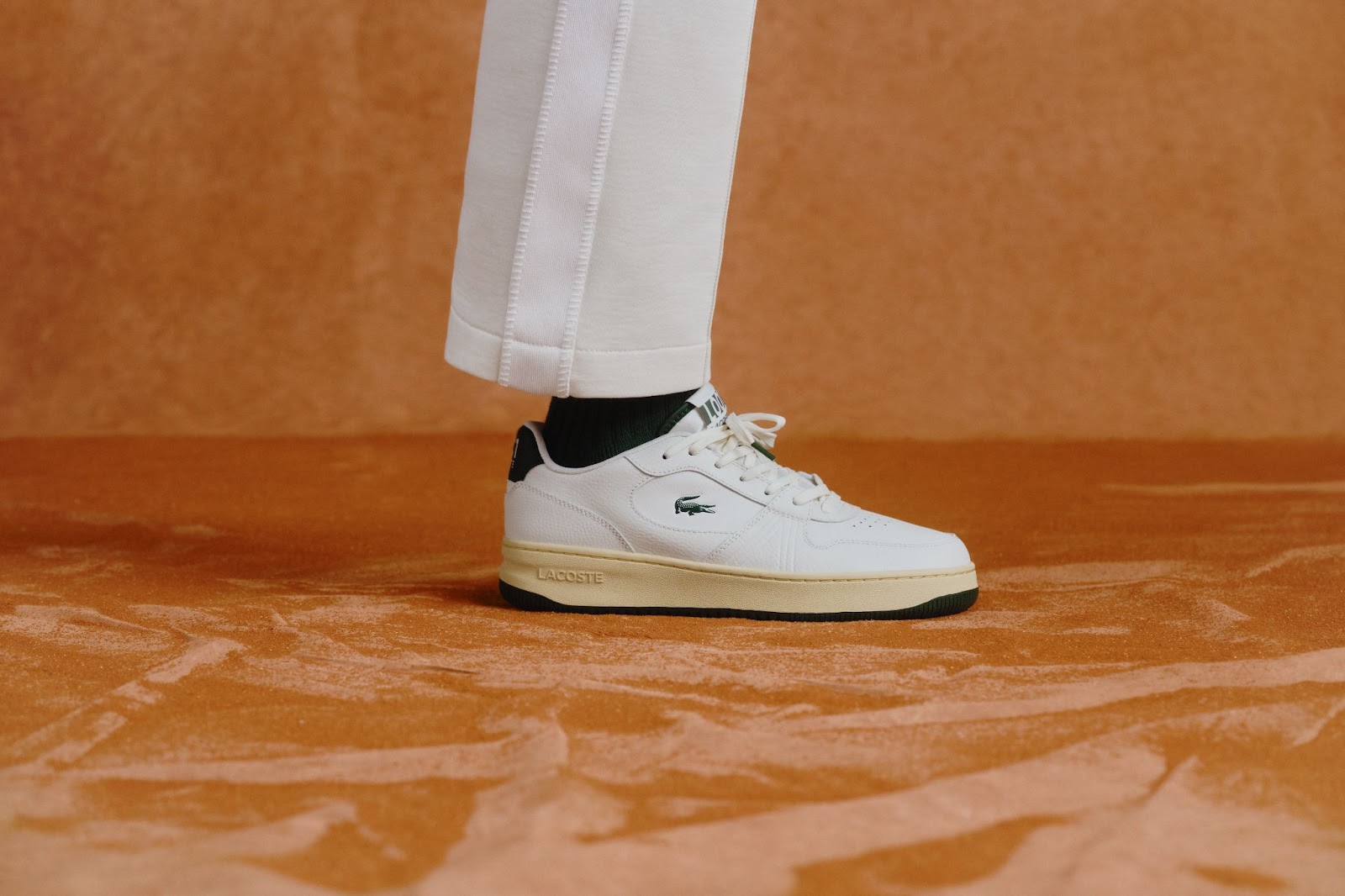 A opção elevada traz uma entressola off-white elegante e rótulos vintage, enquanto a versão premium, feita de couro nappa, oferece um design totalmente branco, representando a simplicidade e a sofisticação da Lacoste.