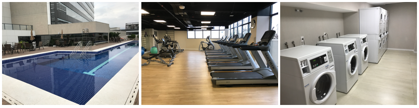 Serviços: Piscina aberta com raia, fitness center 24 horas e lavanderia.
