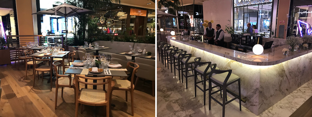 Quem vê a ilha de 70 lugares no meio do shopping, projetada em madeira clara, não imagina o quão requintado o Del Plin se apresenta ao público. A concepção foi elaborada por Patrícia Anastassiadis e Priscila Payá, que trazem ao restaurante um quê de aconchego sem perder o glamour do shopping onde está localizado. O bar todo em mármore branco é o divisor dos dois ambientes do restaurante: um lounge com mesas e poltronas para quem aguarda o jantar ou apenas quer tomar um drink enquanto aguarda quem faz compras no shopping; e o do restaurante propriamente dito, com mesas amplas em madeira e cadeiras e bancos revestidos em cor cinza, onde a experiência gastronômica se inicia.