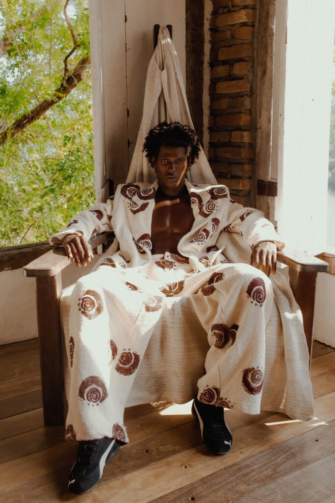 Com sua combinação inconfundível de streetwear e alfaiataria, a Dendezeiro propõe uma nova visão para o sertão, quebrando estereótipos e apresentando uma abordagem contemporânea e diversa dessa região tão significativa. Inspirada por grandes obras literárias como Vidas Secas, a coleção captura a essência da perseverança e da resiliência, como explica Hisan.