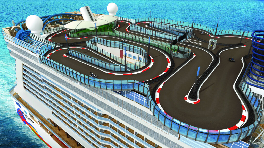 Como a única empresa a oferecer karts no mar, a Norwegian Cruise Line está expandindo seu portfólio com uma pista de corrida maior e melhor em dois níveis no Norwegian Encore. Com quase 350 metros de curvas emocionantes e quatro pontos que se estendem por até 4 metros sobre o lado do navio, os hóspedes poderão desfrutar da maior pista de corrida no mar. Upgrades adicionais incluem uma área de visualização coberta no centro da pista, onde os hóspedes podem fornecer aos karts que passam um impulso adicional, marcando-os com um feixe de laser.