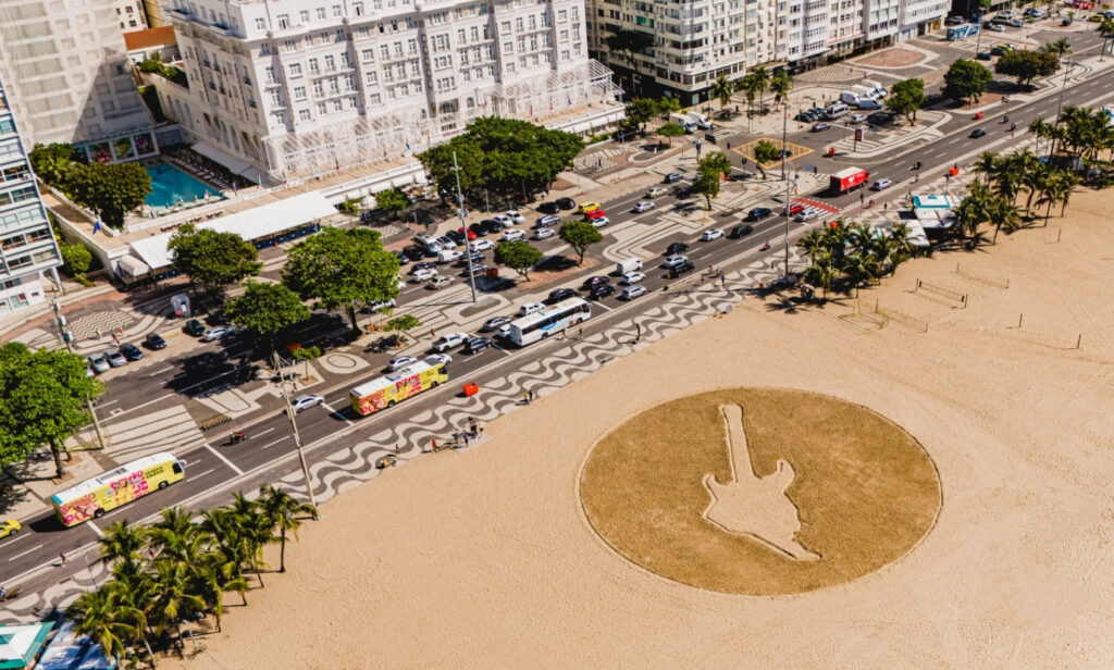 O Rio de Janeiro amanheceu nesta quinta (27) com um atrativo a mais na Praia de Copacabana. A icônica guitarra do Rock in Rio ganhou uma versão gigante e foi desenhada diretamente na areia. A ação marca o lançamento de uma promoção que dará ingressos para os fãs curtirem o festival.