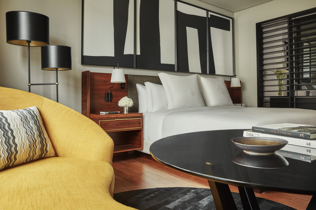 Logo na entrada, há um trio de esculturas assinadas por Francisco Brennand que repousa acima do piso de mármore titanium, vindo do Acre. O olhar é rapidamente atraído por uma escada espiralada ao fundo, cujo verso vermelho a torna impossível de ser esquecida. Esse detalhe é apenas um entre muitos que fazem referência ao trabalho de Oscar Niemeyer, com suas curvas e estética minimalista. Ainda, uma instalação com 537 luzes de cristal num fundo infinito paira sobre a recepção do Four Seasons São Paulo Nações Unidas. Nos pequenos detalhes a brasilidade também marca presença, como no revestimento de parede feito a partir de fibra de folha de bananeira e fios de seda, que garantem uma personalidade brasileira e elegante para o lobby, spa, academia e 258 quartos e suítes.