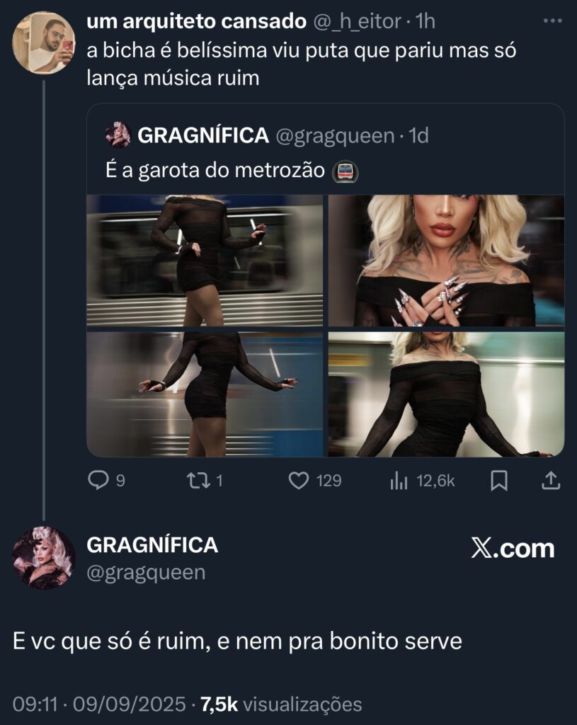 Comentando um ensaio postado pela drag queen, um usuário do X escreveu que Grag é belíssima, mas só lançaria música ruim. Foi o suficiente para ela responder de forma direta: “E você que é só ruim, e nem pra bonito serve”.