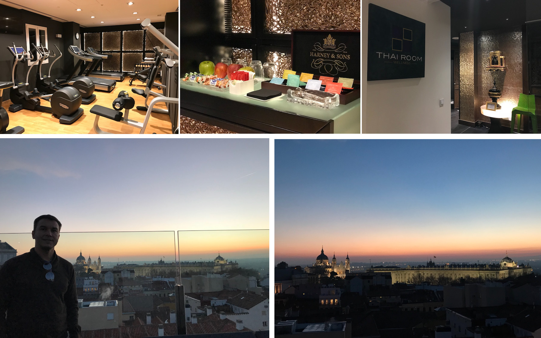 Na área de lazer, o Gran Meliá Palacio de los Duques também não deixa a desejar. Com uma academia bem equipada por aparelhos de musculação e aeróbicos, o hóspede ainda conta com toalha, água e chás para durante e pós-exercício. Ao lado está o Thai Room Wellness, spa exclusivo com rituais orientais que incluem banhos de ervas, tratamentos faciais e corporais e terapias de cuidado com a pele. O agendamento é necessário. No terraço do hotel, uma joia: a incrível vista dos telhados de Madrid, incluindo a Catedral de Almudena e o Palácio Real. Pudemos presenciar de lá um lindíssimo pôr-do-sol logo em nossa primeira noite no hotel. Ainda no deck há uma piscina, que só funciona nos meses mais quentes, assim como o bar.
