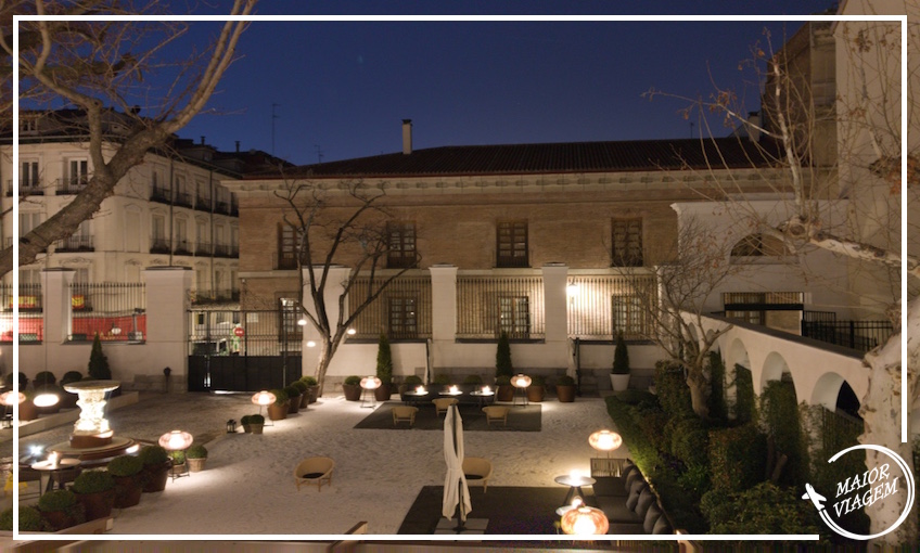 Ladeando também a recepção, uma grande sala – onde ficava originalmente o claustro – ostenta uma abóboda de cristal incrível de onde cai um lindo lustre dourado, que contrasta com o mobiliário revestido em cores preta e bege. Já a parte externa, é um charme a mais para o belíssimo hotel. O Jardim Histórico de 1000 m² é único no centro de Madrid e se torna um espaço calmo, com zonas verdes e mesas e poltronas onde o hóspede pode relaxar enquanto lê uma revista, descansa ou vivencia uma experiência gastronômica. Se já adoramos o jardim durante os dias de inverno, fico imaginando a vida que ele não deve ganhar nas noites quentes de verão.