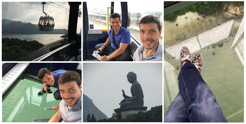 Apesar de estar mais afastado do centro, mais precisamente na ilha de Lantau, o acesso ao local é tranquilo de metrô. Nessa mesma ilha ficam o aeroporto de Hong Kong e a Disneyland, por isso mesmo a quantidade de turistas indo nessa direção é grande. Do centro da cidade, é só seguir até a estação Tung Chung através da linha de mesmo nome: Tung Chung Line. Dessa estação existem duas maneiras de chegar a Vila Ngong Ping, que fica na base do Grande Buda de Hong Kong: a primeira e mais barata é de ônibus (o trajeto leva cerca de 40 minutos), mas a mais interessante é mesmo utilizando o teleférico Ngong Ping 360 Cable Car. Esse passeio de teleférico leva 30 minutos e garante uma vista espetacular da ilha, do aeroporto e do próprio Grande Buda (no mapa que ganhamos ao comprar os ingressos existe até a indicação dos melhores pontos para avistá-lo no trajeto). São dois tipos de cabines (claro, com preços diferentes): Standard Cabin – HK$ 185 ida e volta – e Crystal Cabin – HK$ 255 ida e volta. Optamos pela última que também tem o chão de vidro e promove uma experiência única, já que o teleférico é bastante alto e o trajeto bem interessante (passando por cima de água e floresta). Apenas não recomendo para quem tem medo de altura, já que é bastante alto e o trajeto é longo.