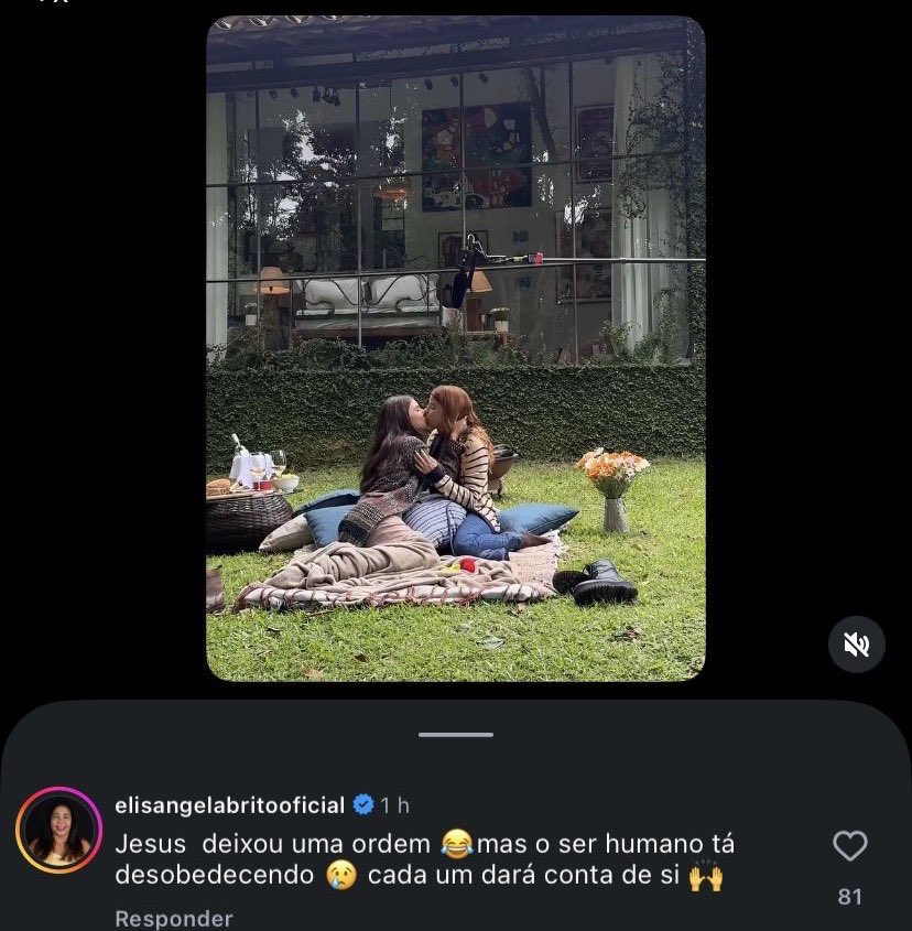 Em um post que mostrava uma cena de beijo das personagens Lorena e Juquinha, interpretadas por Alanis Guillen e Gabriela Medvedovsky, a mãe do ex-BBB usou sua religiosidade para atacar.