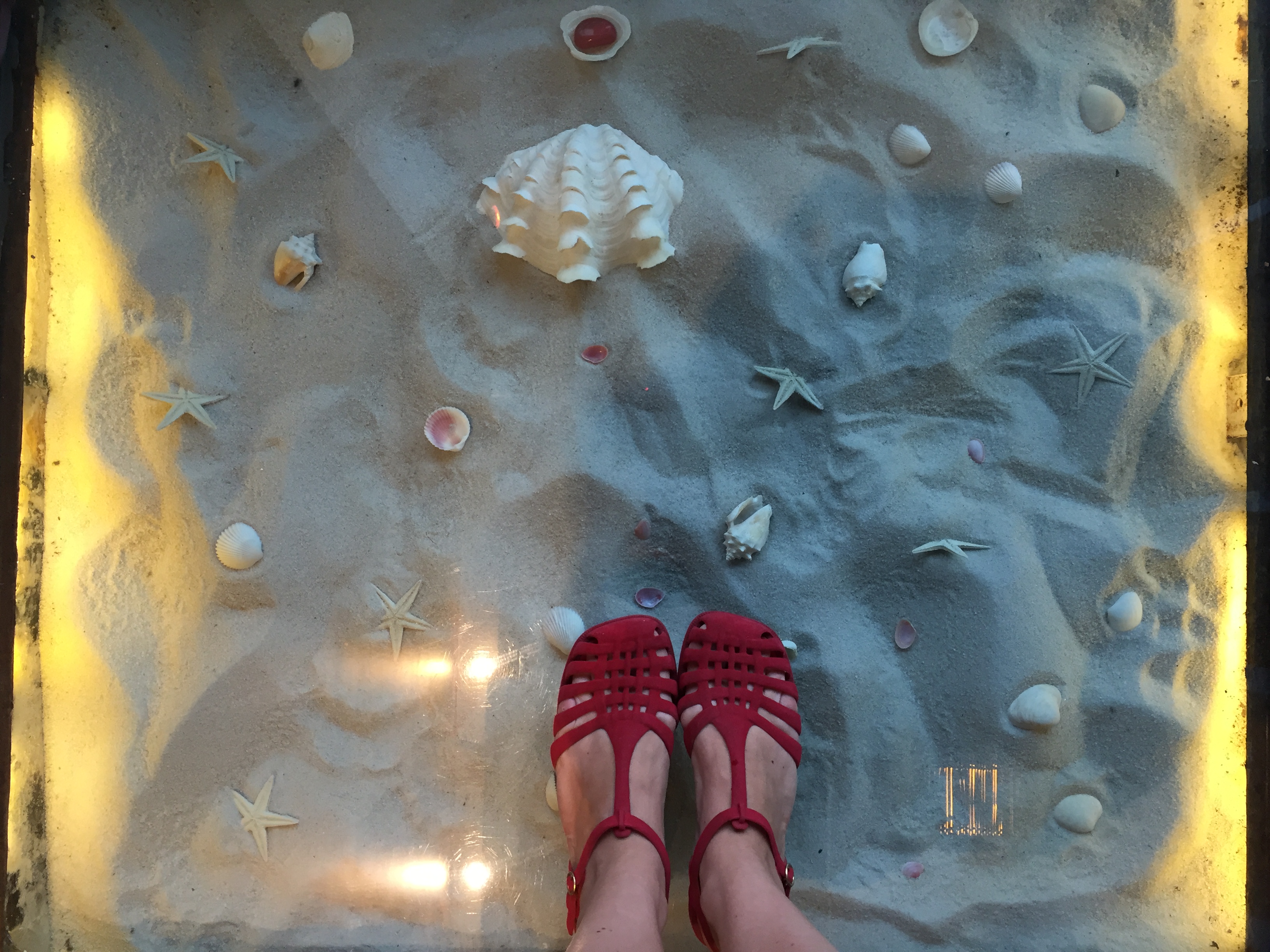 Outro detalhe que merece ser destacado é a passarela em direção à escada para o segundo andar, com piso de vidro sob areia da praia e conchas. Uma graça!