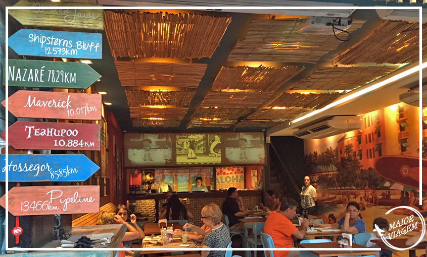 Mahalo é uma palavra de origem havaiana que significa uma forma de agradecimento, um “obrigado”. A decoração do espaço remete ao ambiente praiano, bem colorida e alegre, com referências ao Havaí vintage e ao surf. Logo na entrada, placas de madeira sinalizam a distância e a orientação dos principais destinos de surf no mundo a partir dali. Bem criativo!