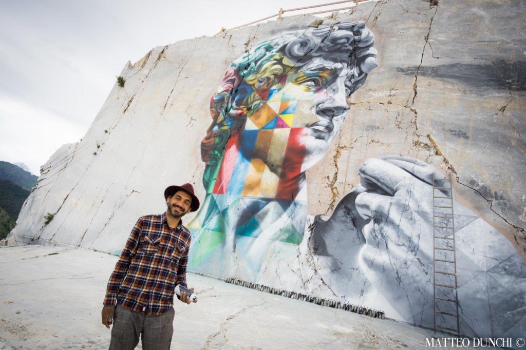 Os painéis de Eduardo Kobra têm ganhado cada vez mais visibilidade, levando o artista a vários destinos no mundo.Após uma viagem por vários países, o muralista brasileiro entregou recentemente o mural que fez em Carrara, na Itália. O mural de Kobra é inspirado na obra “Davi” de Michelangelo.