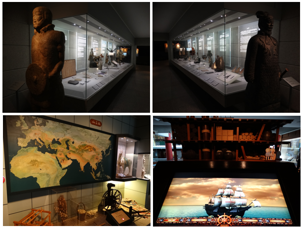 Logo na entrada da visitação, um corredor bem interessante mostra de um lado a cultura portuguesa e do outro a oriental, manifestada em diversos aspectos: grandes impérios, navegação, escrita, filosofia, ciência, tecnologia e religião. Na sequência atividades comerciais, culturais e religiosas das duas culturas são apresentadas de forma bem didática, incluindo uma instalação cenográfica com prédios de influência das duas culturas onde no interior é mostrado mais a respeito. Há ainda espaço para falar nas grandes navegações, fundamentais para o comércio local e do mundo e o quanto elas levaram coisas asiáticas para o mundo e trouxeram influência europeia para Macau. Um dos aspectos mais interessantes é ver, por exemplo, como os nomes variam conforme a origem da colonização. Em uma apresentação interativa (aliás, a interatividade é bastante presente no museu), é apresentada como a palavra “chá” é dita em diferentes países, demonstrado que a grande diferença é conforme a colonização da região chinesa.