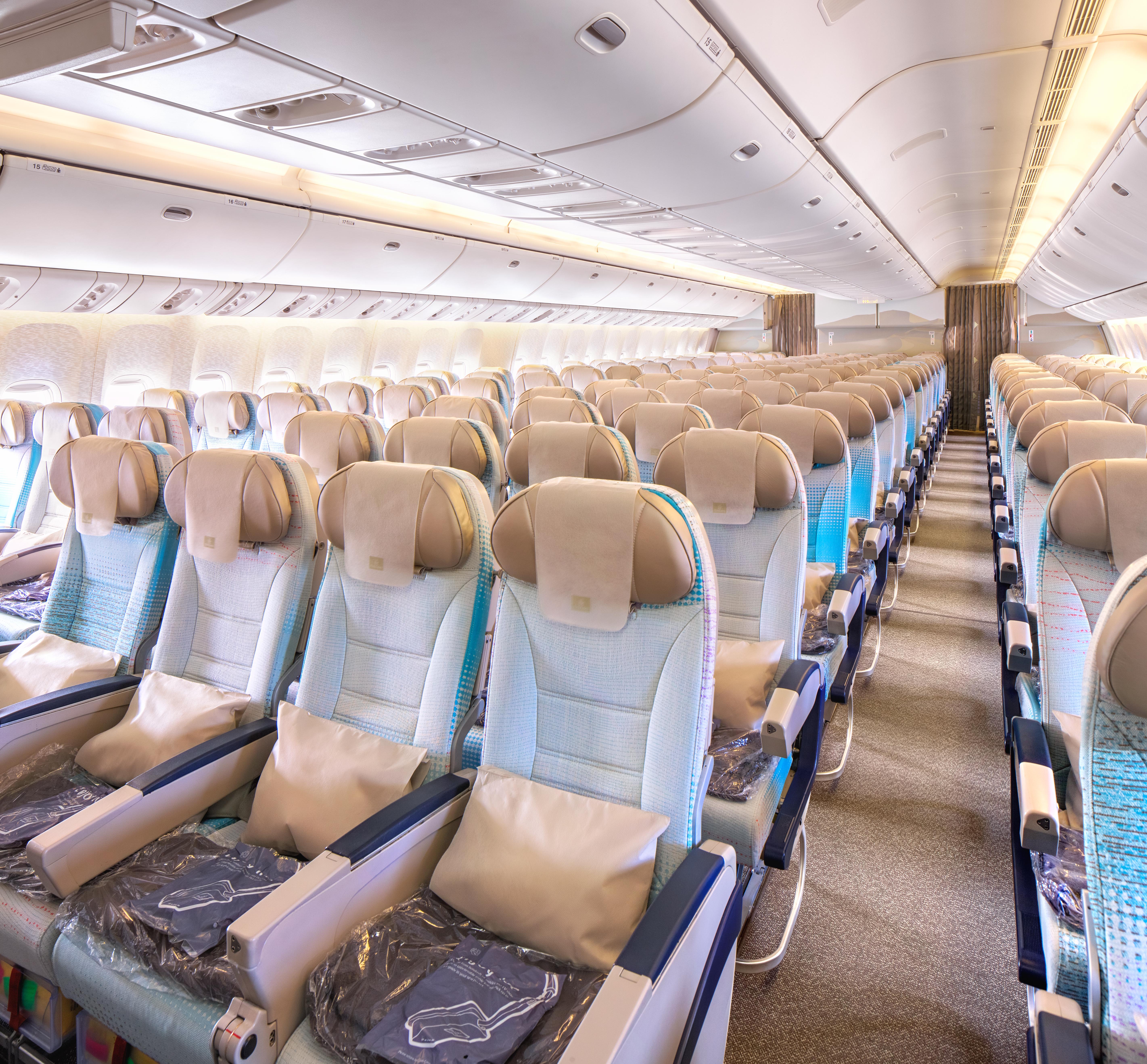As mudanças na frota do Boeing 777 da Emirates também aconteceram na classe econômica. Os assentos com design ergonômico vêm com encostos de cabeça de couro com painéis laterais flexíveis e também podem ser ajustados verticalmente para um mais conforto. Ainda, foram atualizados para a mais recente paleta de tons de cinza claro e azul.