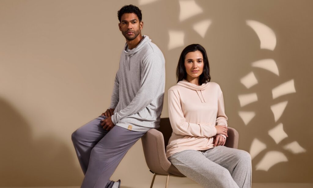 O conjunto feminino é apresentado em tons de rosa suave e cinza claro, enquanto o design masculino possui uma paleta em dois tons de cinza. Pantufas e máscaras de dormir combinando, também confeccionadas em modal macio, completam o conjunto.