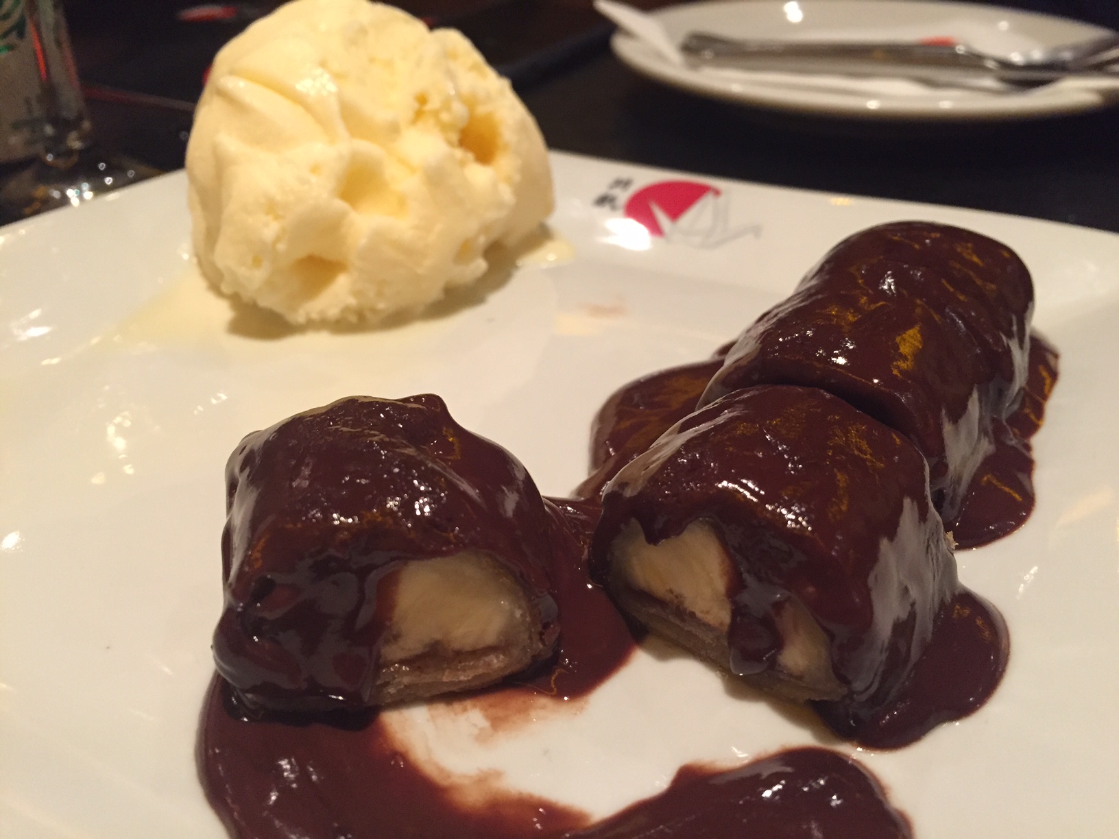 De sobremesa, seguimos a sugestão do Carlinhos, gerente da casa, o Harumaki de banana com calda de chocolate, que é uma das mais pedidas na casa. O rolinho vem acompanhado de uma bola de sorvete de