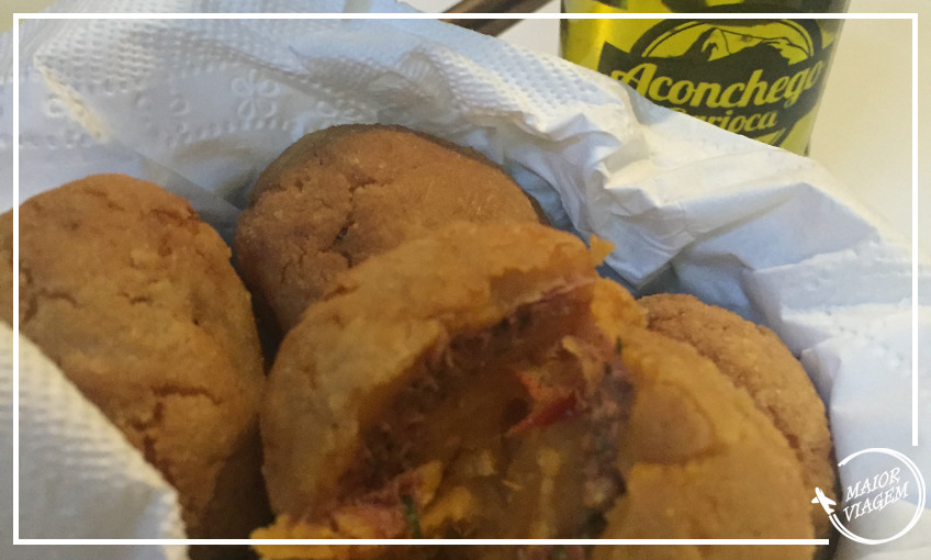 Uma coisa que me chamou a atenção no cardápio foi a possibilidade de escolher pratos que inclusive podem ser divididos por duas pessoas. Mas não foi dessa vez que provamos os pratos, optamos mesmo pelos petiscos. Pedimos de início o carro chefe da casa, o bolinho de feijoada que é o petisco mais famoso e mais copiado. A porção de 4 bolinhos vem acompanhada de torresmo e um shot de batida de limão, o que achei o máximo. O bolinho é recheado com couve e bacon e apesar de ser gostoso, outro bolinho me agradou mais, o de baroa recheado com camarão – tem também o recheado com carne seca (foto de capa) – que vem servido em uma porção de 6 unidades.