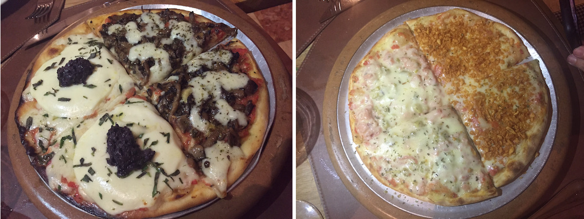 Antes de escolher o sabor da pizza, imperdível experimentar as Casquinhas de Pizza (pizza branca – foto de capa) nos sabores de ervas finas e parmesão e ervas finas com gorgonzola. Totalmente viciante! São mais de 30 sabores de pizza e escolhemos quatro sabores para degustar: Due Funghi (shimeji e shitake refogados e coberto com muçarela de búfala); Caprese (muçarela de búfala, tomate caqui e pesto de azeitonas pretas); Argentina (muçarela salpicada com alho frito picado); e a Da Casa (presunto e azeitonas verdes picados, cobertos por muçarela), que recebe esse nome por ser a preferida da família Nóbrega.