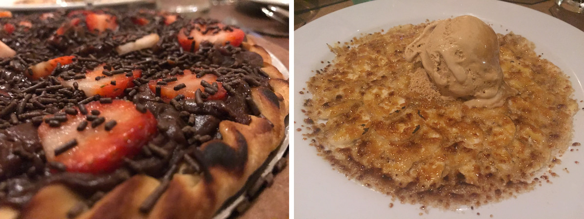 Para sobremesa, quatro sabores de pizza doce, dos quais experimentamos a de Chocolate com Morango. Porém, além das pizzas, vale a pena experimentar o maravilhoso Carpaccio de Banana Brulée com gelato de caramelo com flor de sal. Simplesmente sou fã!