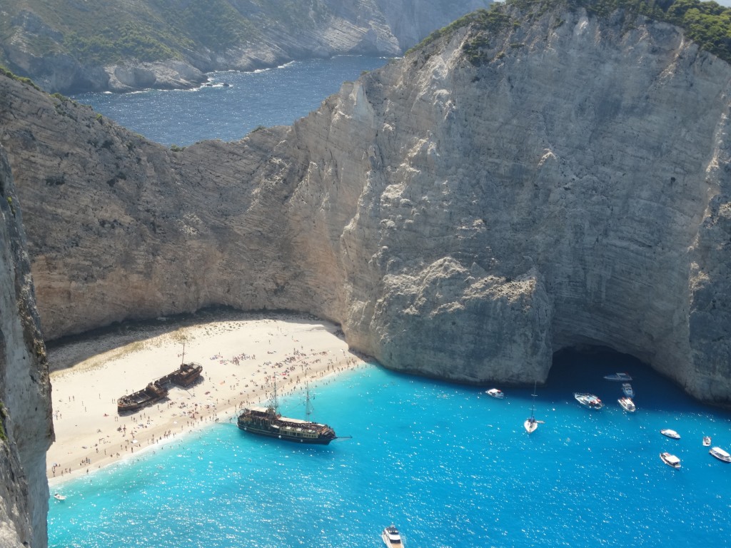 Considerada por vários anos uma das praias mais bonitas do mundo, Navagio Beach na ilha grega de Zakynthos, fica abaixo de um paredão de pedra calcária e a única forma de acesso é por meio de barco. A praia recebe esse nome por causa do navio naufragado que estaria contrabandeando cigarros, quando encalhou na enseada e hoje virou um dos símbolos da praia.