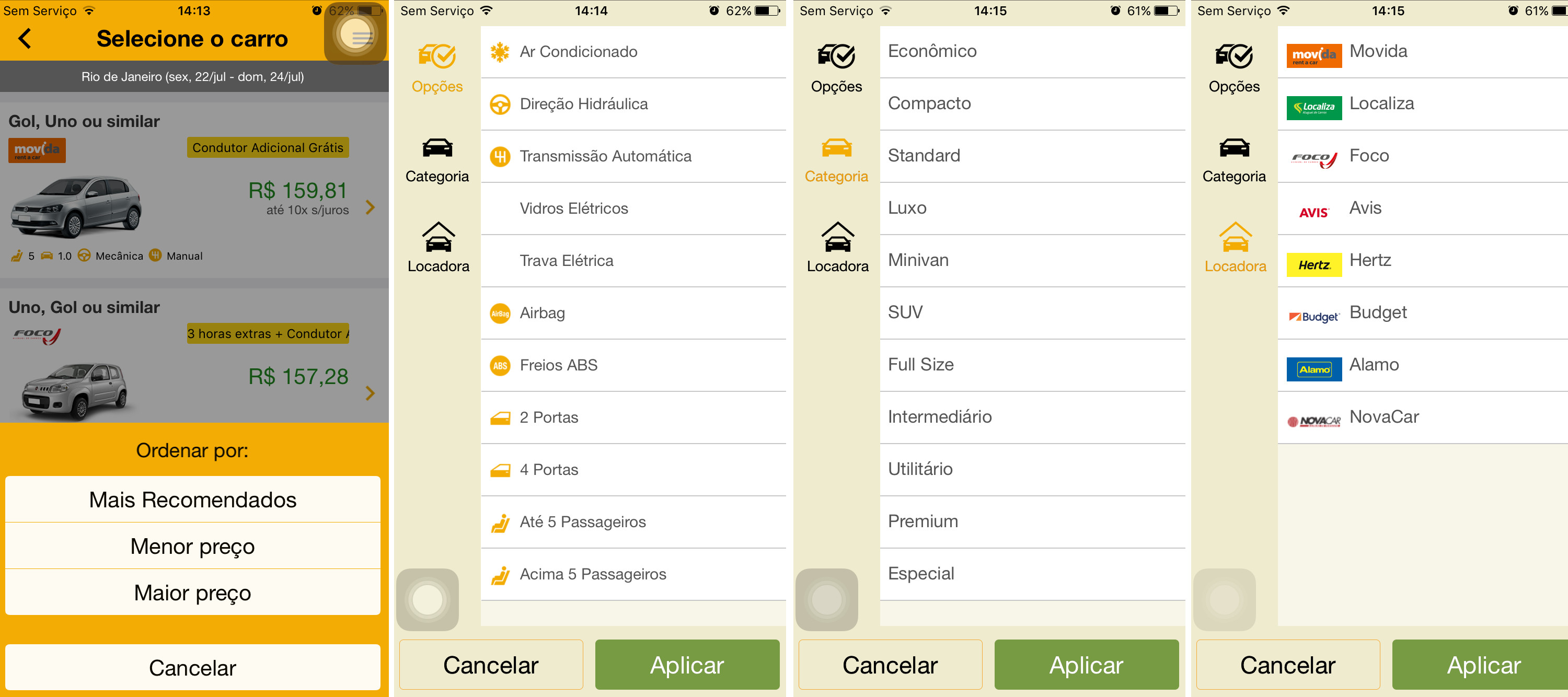 O aplicativo traz como resultado da busca todos os carros disponíveis com preço. O usuário tem a opção de ordenar por Mais recomendados, Menor preço e Maior preço. Além de filtrar a busca por Opções no carro, Categoria e Locadora. Além de todas as funcionalidades para locação de veículos, a meu ver a grande vantagem é que o app oferece um processo de locação simples e acessível em qualquer hora e em qualquer lugar. Ideal para as locações de carro feitas de última hora, com retirada no mesmo dia ou com um dia de antecedência, quando muitas vezes o cliente não está em frente ao computador para concretizar a reserva.