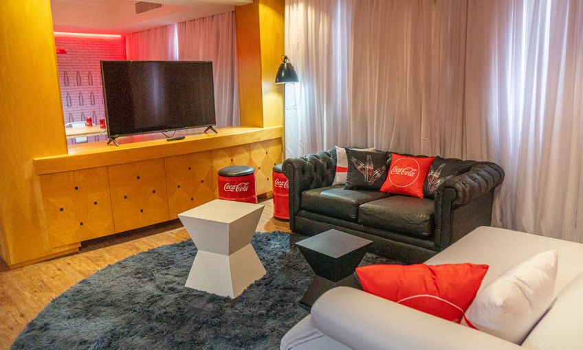 O apartamento de 66 m² está todo decorado com o icônico logo em seus diferentes estilos. Dos lençóis da cama aos itens do banheiro, o quarto da Coca-Cola abraça os hóspedes ao promover uma vivência completa passando por quadros icônicos e garrafas estilizadas. Claro o frigobar, que também está decorado com a marca, está repleto de bebidas geladas.
