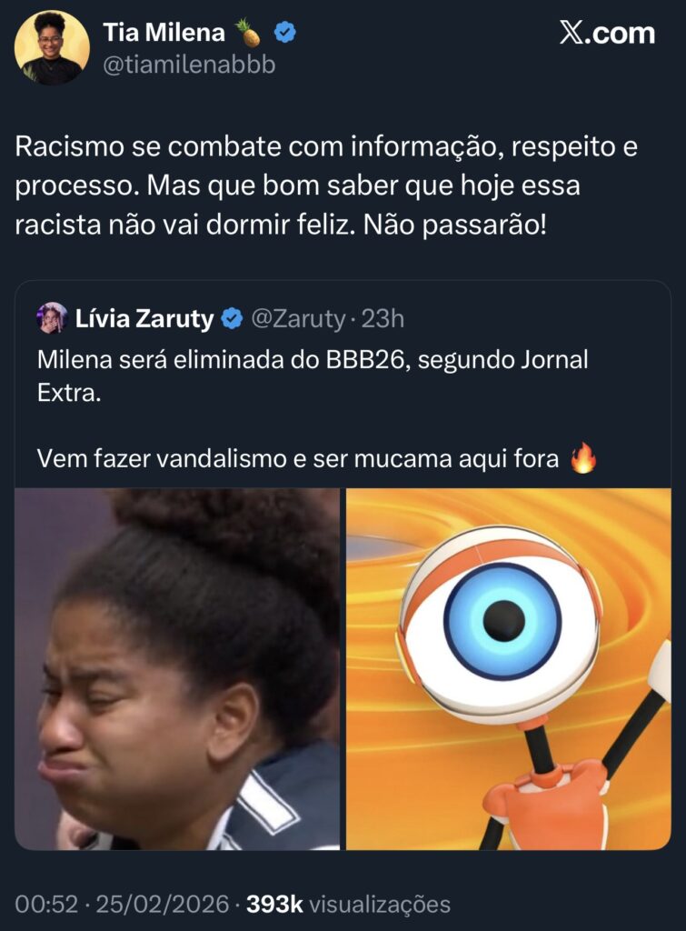 Compartilhando uma matéria do Jornal Extra afirmando que Milena seria a eliminada, a usuária que se apresenta como Lívia Zaruty escreveu: “Vem fazer vandalismo e ser mucama aqui fora”. Esta inclusive não foi a primeira vez que ela se refere a participante do BBB 26 desta maneira.