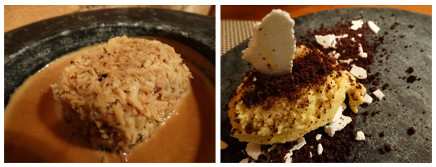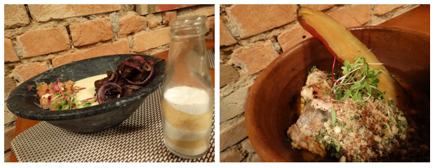 Mas mesmo para quem não opta pelo menu, o serviço à la carte tem opções maravilhosas. De entrada optamos pelos tradicionais pintxos de tapioca – massa de tapioca com queijo manteiga, recheada de shimeji e rúcula selvagem – e os deliciosos bolinhos de mandioquinha com piracuí acompanhados com molho típico canário a base de pimentão e pimenta (onde fica clara a mescla de ingredientes brasileiros e espanhóis). Mas ainda tive curiosidade de provar o pão de polvilho recheado com carne de sol e queijo coalho e o ravióli de queijo cabacinha com mini folhas, entre as outras opções que parecem bem interessantes.