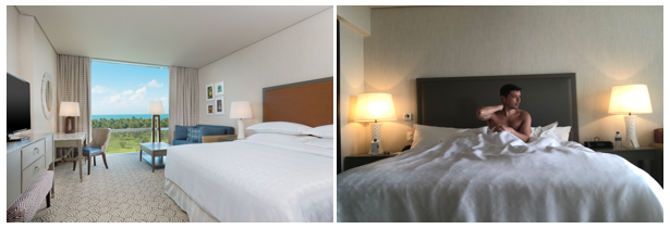 O mobiliário luxuoso também destaca o conforto, assim como o funciona e bom banheiro tem cuidados como a separação do chuveiro e do vaso sanitário, facilitando assim a utilização do mesmo por mais de uma pessoa. O armário tem excelente tamanho, a estação de trabalho é igualmente grande e a cama é super confortável (com assinatura exclusiva da rede Sheraton).