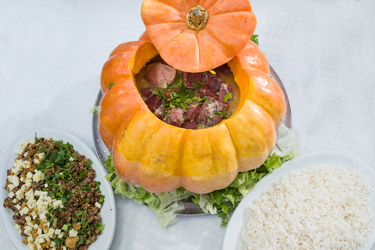 O restaurante Baião de Dois oferece a carne seca com abóbora na moranga, servida com molho de tomate ou catupiry (foto). O bar Do Horto, no Jardim Botânico, oferece Bobó de Camarão servido na moranga para duas pessoas. A ideia do bobó é representar um prato típico brasileiro com o costume americano de usar abóboras na decoração das festas de Halloween. Até na pizza, a abóbora é bem-vinda. No Alessandro & Frederico, o pizzaiolo Gennaro Cannone, desenvolveu a pizza Amalfitana, que leva creme de abóbora, mozzarella de búfala defumada, tripolati de funghi fresco e azeite de oliva extra virgem.