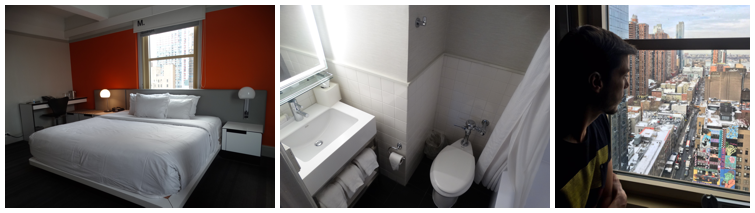 Mesmo com esses pequenos problemas, a estadia no hotel foi positiva já que o quarto era muito bom, a equipe atenciosa e a localização excelente. O hotel oferece ainda lounge com computadores e internet para quem está viajando sem o seu, wi-fi gratuita e de ótima qualidade (apesar da quantidade de hóspedes), uma loja de conveniência para atender as pequenas demandas dos hóspedes no lobby e espaço fitness aberto 24 horas (uma raridade em hotéis) de boa qualidade. Na gastronomia outro destaque é o charmoso District M, bar do lobby que conta com apresentação de DJs em dias especiais, e serve como uma ótima opção para refeições rápidas ou um encontro com amigos para beber antes de sair para curtir a noite de Nova York (comemos uma pizza deliciosa e os drinks que experimentamos eram bem saborosos). Além dele o hotel tem o City Kitchen, aberto também a não hóspedes, que é um mercado indoor de alimentos com diversas opções de comidas famosas em toda Nova York.