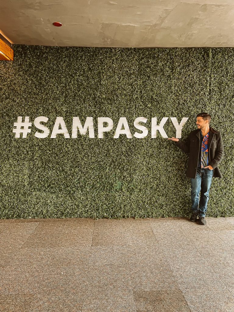 Enquanto aguarda a senha eletrônica, que garante mais conforto e evita filas, os visitantes podem já ir aproveitando a vista de todo o andar, com os janelões de vidro, esperar no café disponível e ir fazendo fotos nas duas paredes instagramáveis. Uma com o desenho das calçadas paulistas feito por Mirthes Bernardes e outra de plantas vivas onde está a #sampasky.