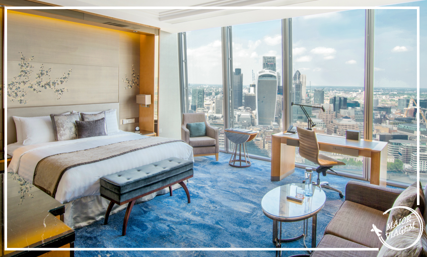 O lobby está situado no 35º andar (o hotel está entre o 34º, destinado a área de eventos, e o 52º) e oferece uma vista de tirar o fôlego. Como boas-vindas a Londres, além dessa vista espetacular, um discreto balcão de atendimento revela uma simpática e prestativa equipe pronta para fazer inesquecível a sua estadia no local. O chão em mármore, o mobiliário discreto e os tons e texturas usados na decoração foram pensados para harmonizar com o principal atrativo: a vista da cidade. Tudo pensado em detalhes para criar conforto e uma experiência perfeito em um hotel de luxo em Londres.