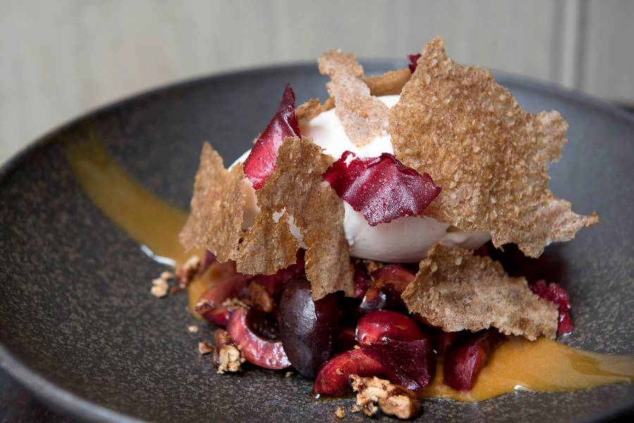 Cherry-Gramercy-TavernGramercy Tavern é conhecida pelo seu menu sazonal priorizando produtos vindo de fazendas e produtores locais. Na sobremesa o chef Miro Uskokovic manteve essa tradição. Seu hábito matinal de uma tigela com aveia aromatizada com canela e cerejas frescas com maple syrup foi levado ao restaurante. A Cherry é a releitura desse café da manhã em uma sobremesa fria usando ingredientes da Union Square Greenmarket, bem próxima ao restaurante. É uma torre de maple butter, sorvete de horchata e granito de cereja coberta com crisp de aveia, nozes e dois tipos de cereja.