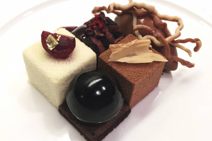 floresta-negra-le-bernardinA Torta Floresta Negra foi uma das sobremesas preferidas do chef Thomas Raquel na infância. No Le Bernardin ele oferece uma versão moderna da clássica sobremesa alemã. O bolo é reencarnado em quatro cubos individuais: uma mousse de baunilha com cereja, um creme de baunilha com chocolate amargo, um bolo de chocolate com creme de cereja e um ganache de chocolate. São agrupados e cobertos com nibs de cacau confitado, cerejas, cachos de chocolate e sorvete de chocolate.