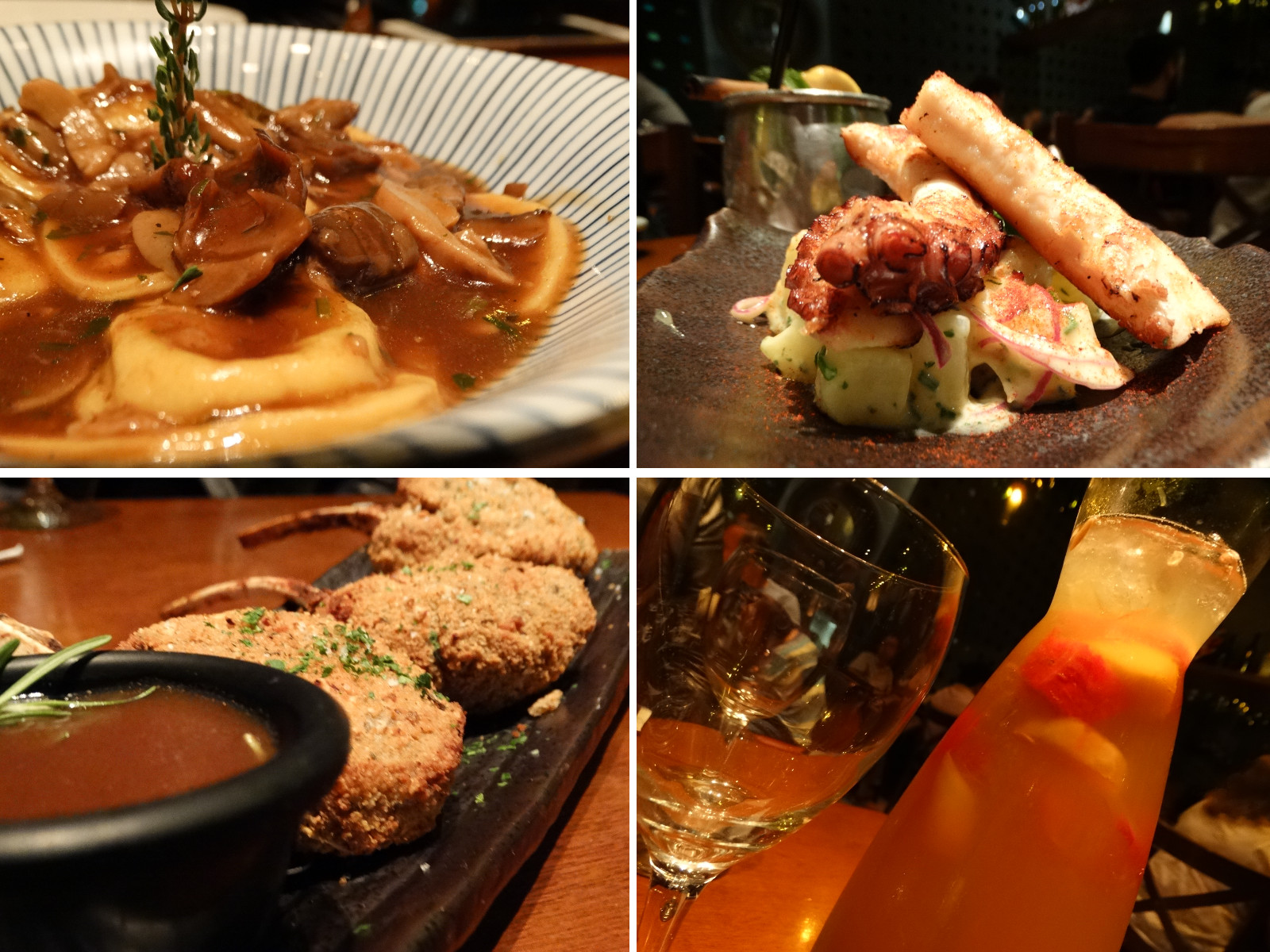 Outra delícia do menu de primavera foi o raviole de cordeiro com molho de vinho, que pedimos junto com dois pratos do cardápio comum da casa e queridinhos da chef, como ela mesmo nos contou: o polvo grelhado com salada de batata e mostarda dijon e o carré de cordeiro em crosta de avelã e alecrim ao molho de vinho tinto. Todos os três pratos estavam divinos e para finalizar pedimos a panelinha de frutos do mar grelhados ao perfume de limão siciliano. Tudo acompanhado de Clericot, Stuzzi Spritz e Giallo Spritz, que vêm em garrafas de 1 litro, servindo muito bem três pessoas.