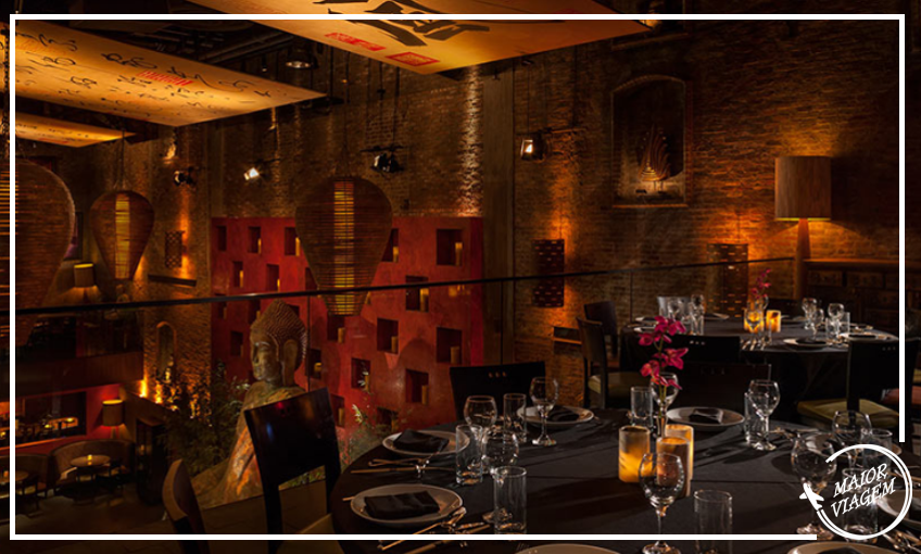 Mas a experiência sensorial vai muito além dos exóticos temperos do menu. Desde a entrada, com banheiras enfileiradas com pétalas de rosa em um corredor com formas arredondadas e iluminação especial, o cliente é convidado a entrar em um universo diferenciado. No salão principal uma enorme estátua de Buda flutua sobre uma piscina com peixes Koi japoneses. Outros detalhes como a parede com peças tradicionais asiáticas dispostas em quadrados coloridos e as divisórias de ambiente completam o clima. A seleção musical completa esse ambiente místico que convida a uma experiência gastronômica inesquecível.