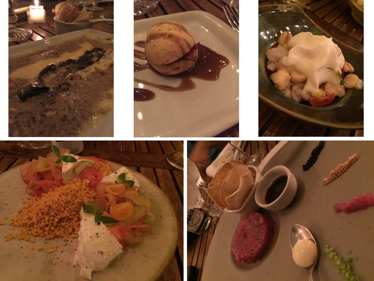 Para entrada, escolhemos: brie com trufas que é um clássico da casa; pão de queijo artesanal recheado de carne seca acebolada, gorgonzola e melado de cana (porção com 5 unidades); ceviche de namorado, milho crocante, dedo de moça, coentro, tomate sweet e espuma de sakê (levemente doce); salada caprese com burrata, tomates, basílico e farinha d’água; steak tartare com diversos acompanhamentos. As cinco entradas que provamos (éramos 9 pessoas) foram aprovadas, inclusive a salada caprese que é servida fora do convencional.